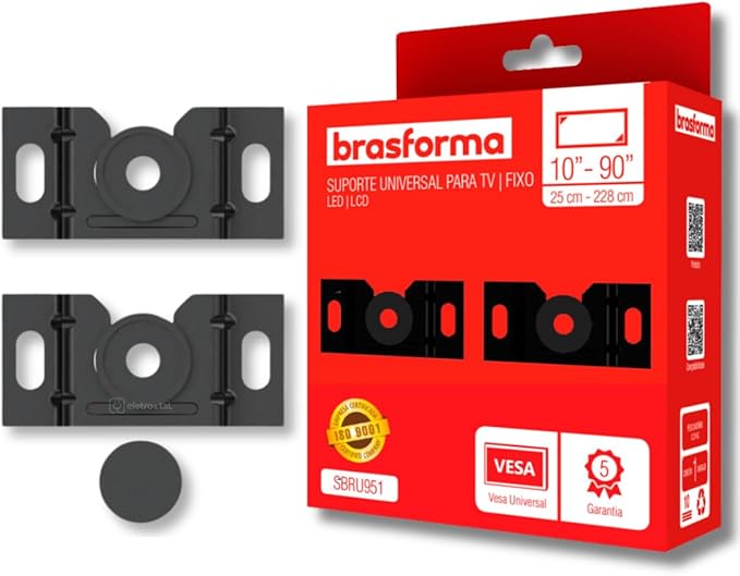 O suporte universal fixo Brasforma foi desenvolvido para TVs de 10 a 90 polegadas, proporcionando uma fixação segura e estável para sua TV LED ou LCD. Sua construção resistente garante durabilidade e suporte ideal para aparelhos de até 228 cm. Compatível com o padrão VESA universal, este suporte facilita a instalação e oferece versatilidade para diferentes modelos de TVs. Seu design compacto e discreto permite que a TV fique próxima à parede, valorizando o ambiente e otimizando o espaço. A embalagem contém o suporte fixo e todos os acessórios necessários para fixação, incluindo parafusos e buchas, permitindo uma instalação prática e segura.